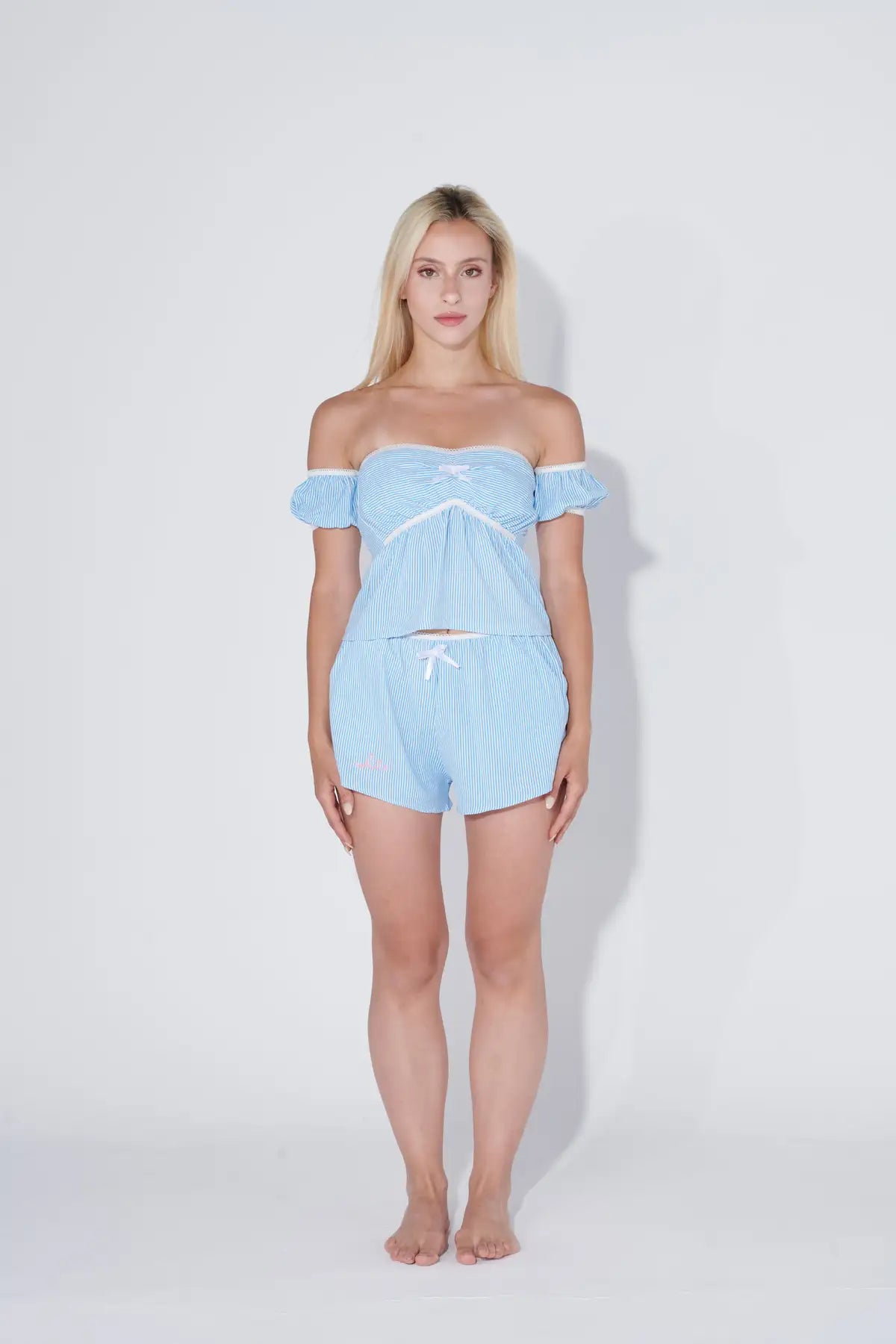 A flirty and feminine two-piece pajama set featuring an off-shoulder crop top with blue and white stripes and a dainty white bow. Paired with matching striped shorts adorned with a soft elastic waistband and a coordinating white ribbon at the center. Breezy, breathable, and perfect for summer nights or lounging in style.