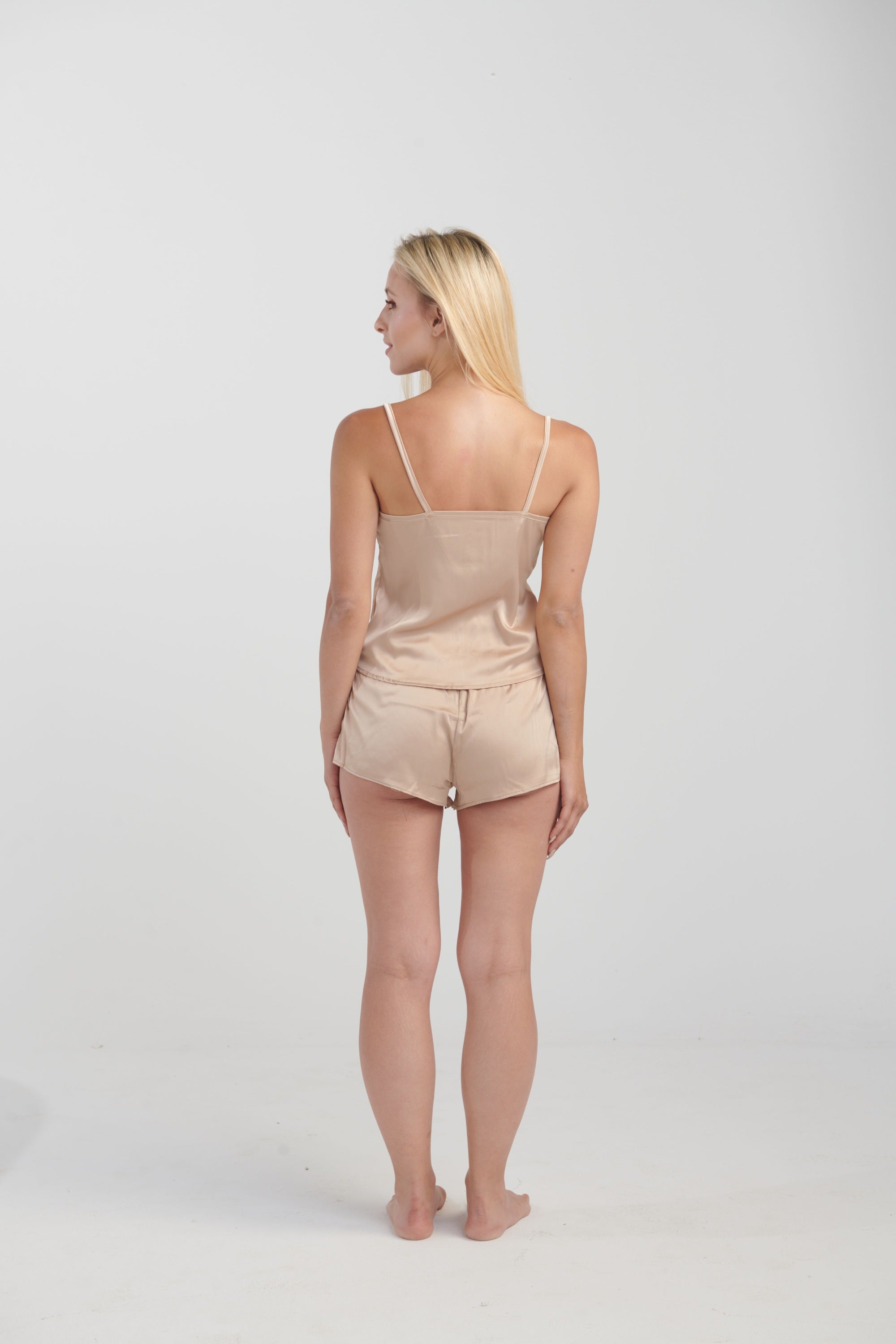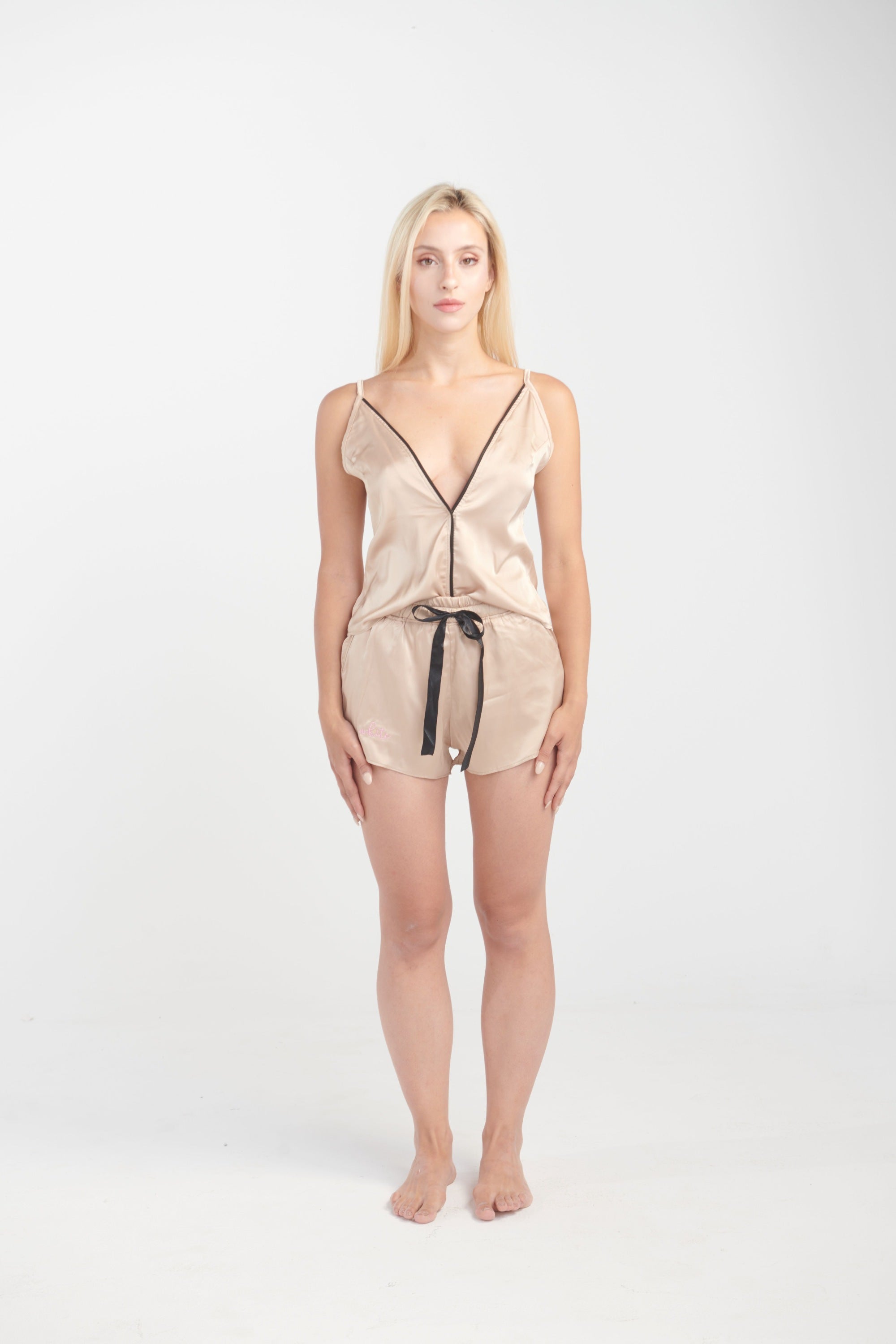 A luxurious two-piece pajama set in a glossy champagne satin finish. The top features a plunging V-neckline trimmed with delicate black outlines and thin black spaghetti straps for a flattering silhouette. Paired with matching satin shorts in a smooth, minimal design. Perfect for effortless glam at home or bedtime elegance.