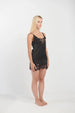 A sultry short black nightgown crafted from smooth satin, featuring a deep V-neckline adorned with black lace detailing. The hem is scalloped with matching lace for a touch of romance. Perfect for luxurious lounging or bedtime allure.