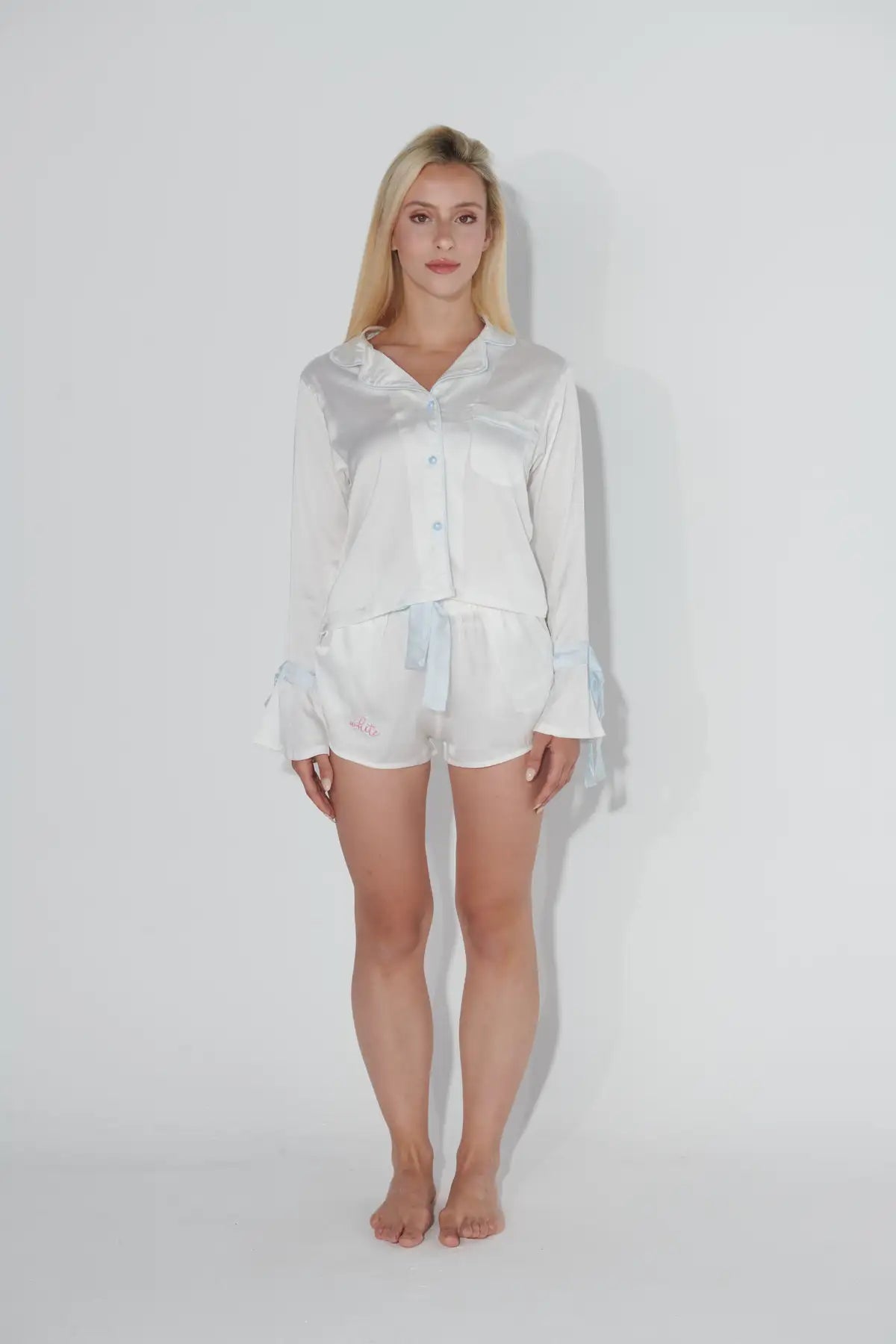 A two-piece satin pajama set featuring a long-sleeved button-up crop top in white with delicate blue outline along the collar and blue satin ribbon bows add a feminine touch at the sleeve cuffs. The matching white satin shorts include a soft elastic waistband and a blue ribbon tie at the front. This set combines charm and sophistication, perfect for dreamy nights or relaxing in style.