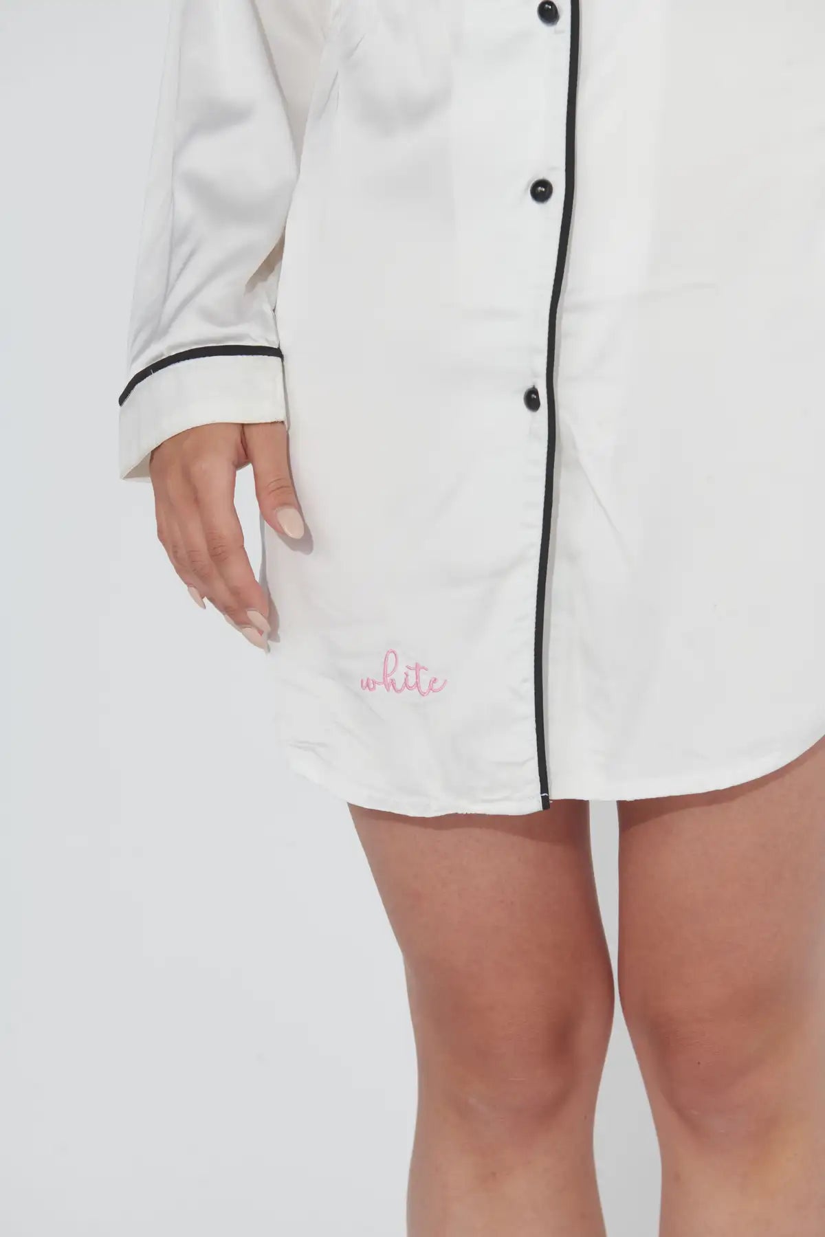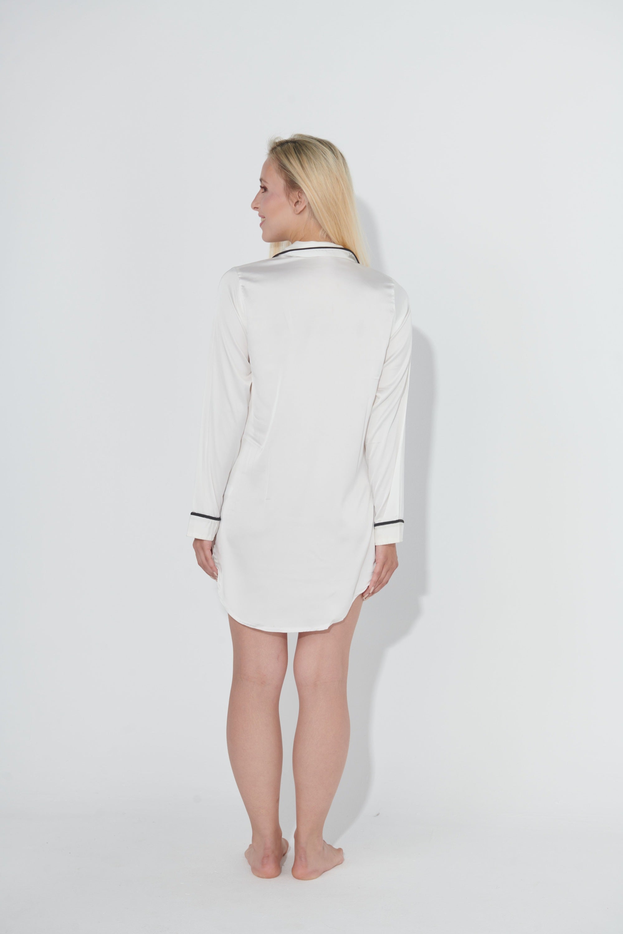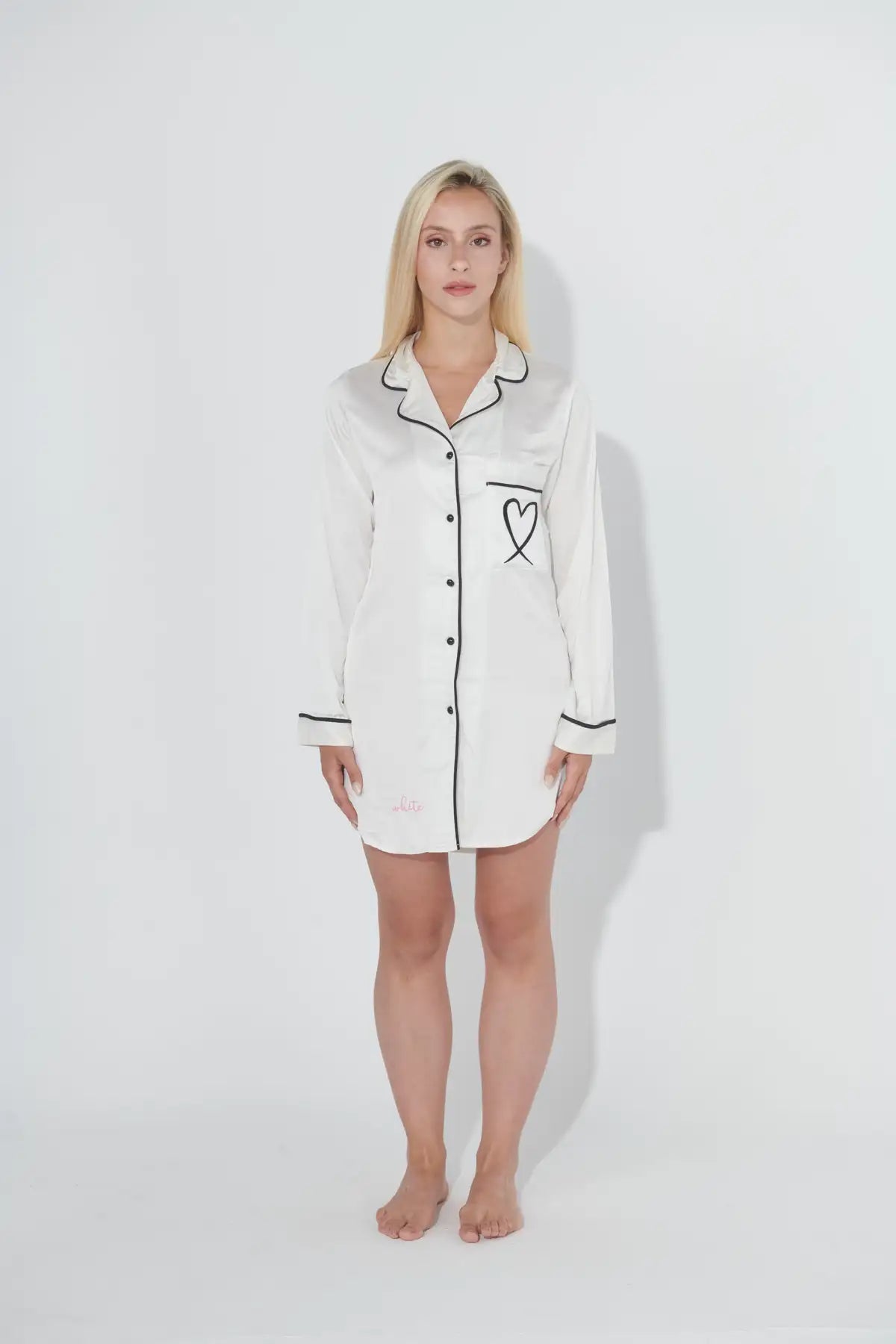 A timeless long-sleeve white night gown crafted from silky satin fabric for ultimate comfort. This elegant piece features sharp black outlines along the collar, placket, and cuffs for a refined contrast, finished with a cute black heart detail over the left chest for a playful twist on a classic silhouette. Ideal for lounging in style or a cozy night’s sleep